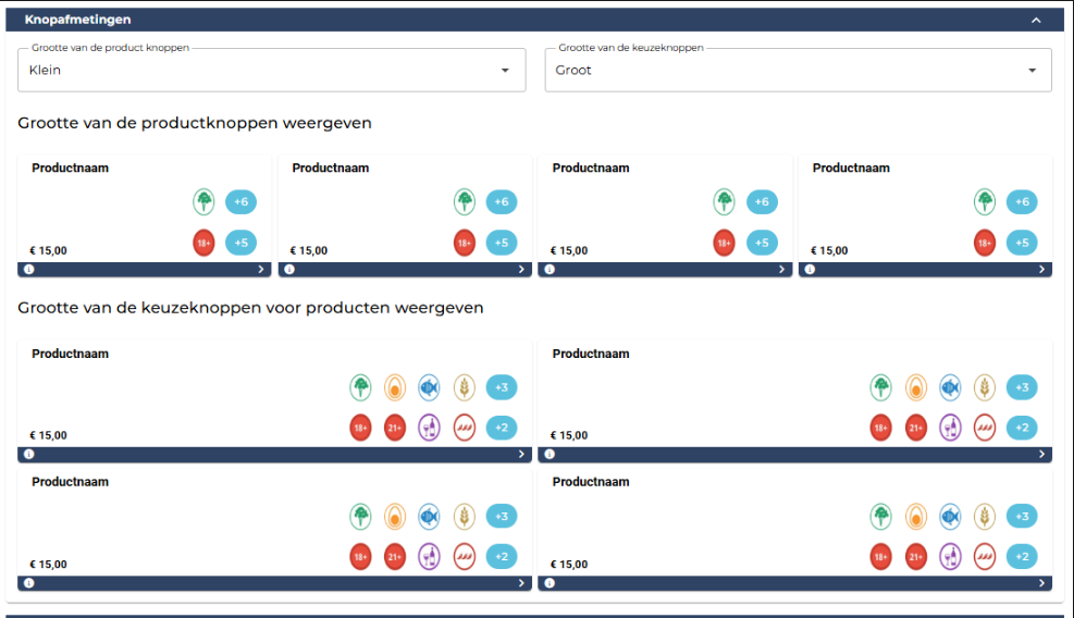 The preview section illustrates how large option buttons appear alongside product tiles.