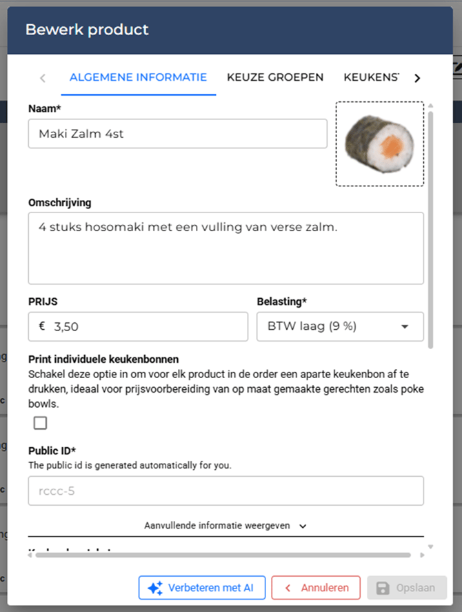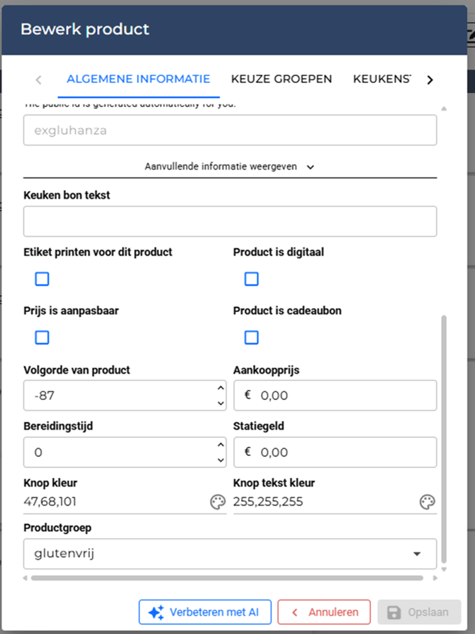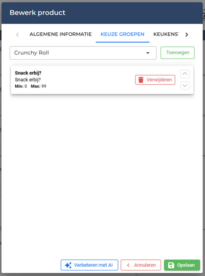 - Keuze groepen (Choice groups): Add or edit choice groups linked to the product.