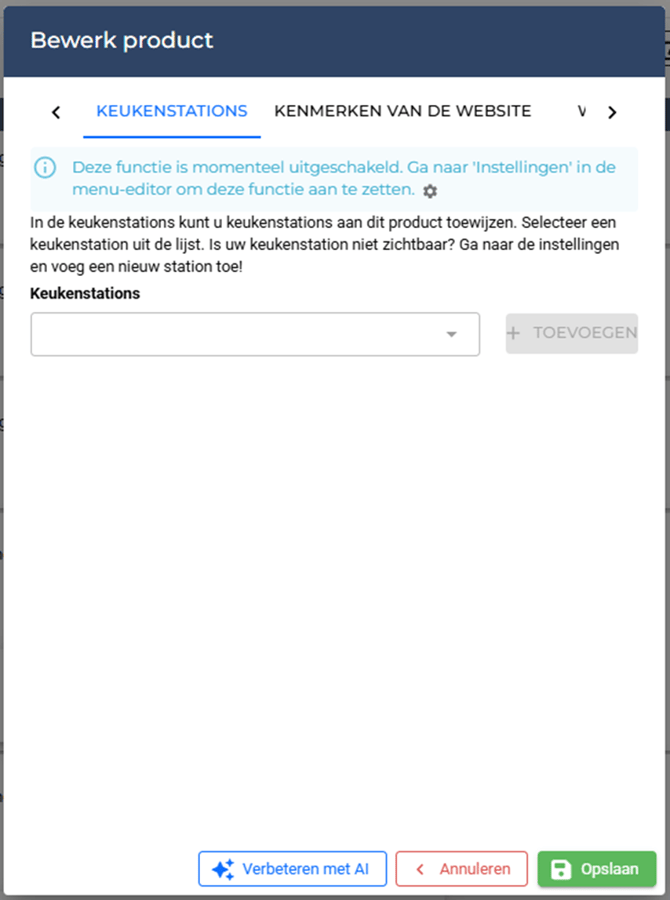 - Keukenstations (Kitchen stations): Decide at which kitchen station(s) the product appears.