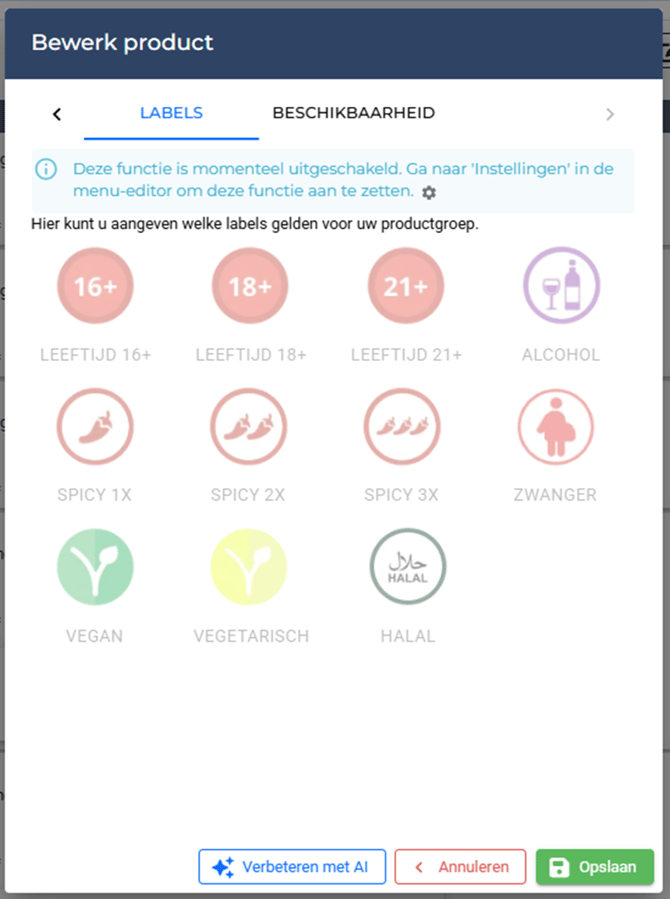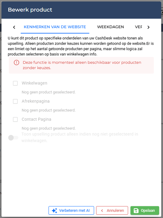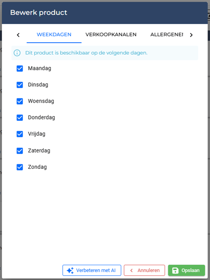 - Beschikbaarheid (Availability): Set availability for a product on specific days or hours.