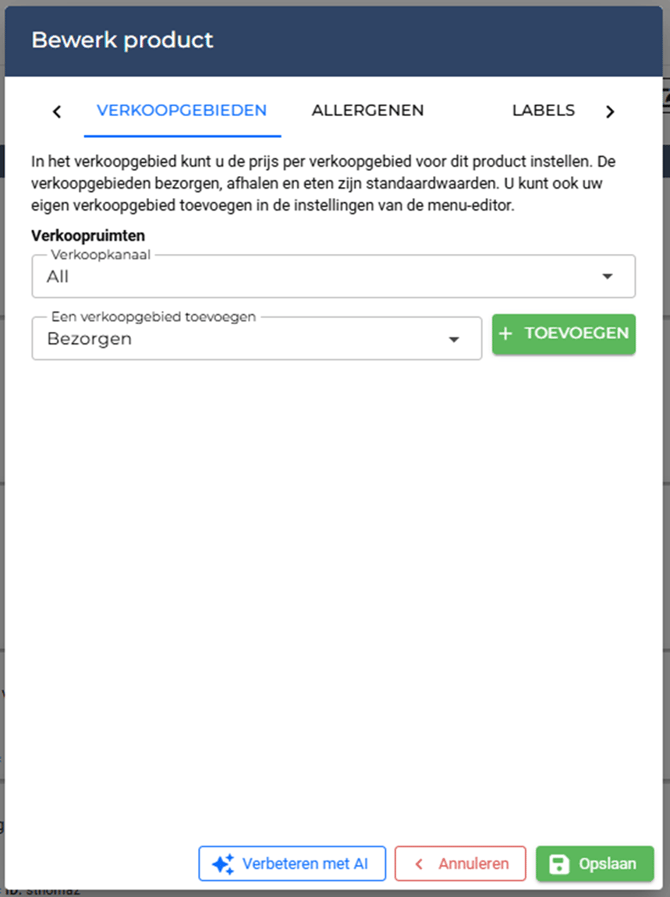 - Verkoopkanalen (Sales channels): Select where the product is available (POS, website, delivery apps).