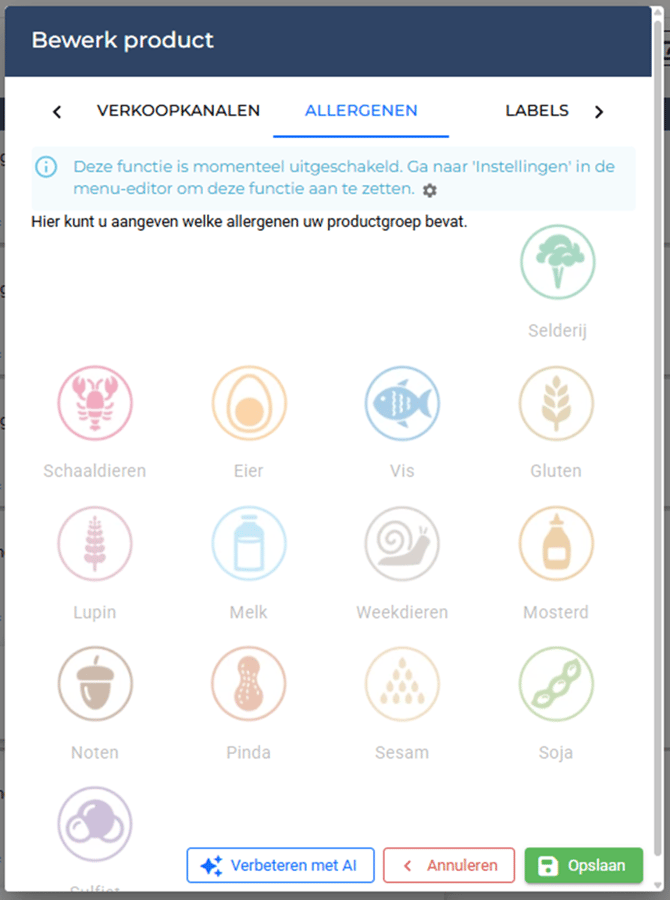 Before you can use certain features in the product editor, they first need to be activated in the settings. Examples of these include sales channels, allergens, or quick product codes. If these options are not enabled in the settings, they will not be visible or available in the product editor. Therefore, it’s important to first check the settings and make sure the required features are turned on, so you can apply them later when editing a product.