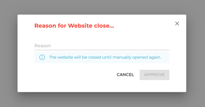 To close your website, enter a reason for the closure and click ‘Approve’. The website will then be marked as closed.
